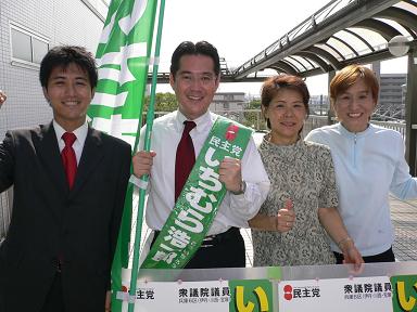 18時から20時までは、民主党の大型街宣車に乗り込み市内を走りました。後部デッキにも激しい雨が降り込んでくる悪天候。宝塚の議員皆で乗るはずだったのに私一人になってしまって心細かったです。