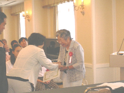 今日は宝塚ホテルで開かれた宝塚市体育協会総会に出席しました。 全国大会で優勝された6名に今年度の市民スポーツ賞が贈られました。 すごい人ばっかりのなかでもひときわ拍手が多かったのは、ソフトテニスの角倉弘子さんです(写真)なんと、75才以上の全国ランキング第1位、春の大会でも見事優勝されたとのことです。 中学生の女子もすごい・・・競泳の白井さん山口さん、飛び込みの辰巳さん馬淵さんペア。そして日本拳法の高校生・金沢さん。おめでとうございます。 午後からは、アトランタ・シドニー・アテネに続いて北京へと、4大会連続オリンピック出場の寺内健選手と馬淵嵩英コーチの壮行会が行われました。 オリンピックの応援が楽しみです♪