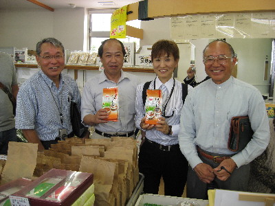 ※先日の「パスカルさんだ」での写真が届きました。 川上伊丹市議・檜田三田市議・北野・尾仲明石市議 特産品の母子茶(ひわださんの地元のお茶♪)