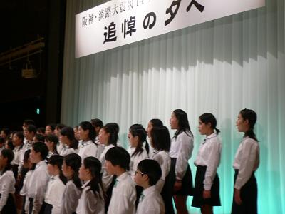 夕方からは、神戸へ。 「阪神、淡路大震災14年 児童・生徒、教職員 追悼の夕べ」に出席しました。亡くなった児童・生徒は371名、教職員は41名です。 今は空のうえでどうしていますか? 桂木小学校合唱団の「しあわせ運べるように」を聴いて・・やっぱり涙がこぼれました。