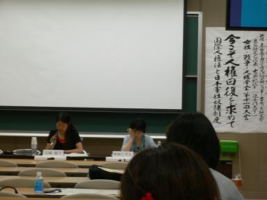 第2部:パネルディスカッション。 ●西野緑さん(大阪府SSW) 専門職としての学校内での信頼。福祉的視点での子ども支援と、教職員集団へのチーム支援を行っている現状を報告されました。 ●日下芳彦さん(元川西市立小学校教員、NPOもみの木スタッフ) 子どもとの信頼関係の中で教育実践をすすめてきた。しかし、子どものオンブズの指摘によって気がついた点も多かった。 ●喜多明人さん(早稲田大学教授、子どもの権利条約総合研究所) 40年間学校を見続けてきてこれほどの危機は今までなかった。これまでは外からの学校破壊であったが、今は内部から崩壊させられてきているのではないか。少人数学級できめ細やかな指導が出来る体制をつくる。SSWを専任制の制度として各学校に配置するなど、抜本的な改革が求められている。 ●吉永さん(千里金蘭大学、子どもの人権オンブズパーソン研究会) 教職員は集団の秩序維持と個々の子どもへの寄り添い、という自己矛盾を抱えながら教育活動を展開。その矛盾が劇化する中で子どもの人権オンブズパーソンが求められてきた。矛盾解決には外かれ手をさしのべていくことが必要。