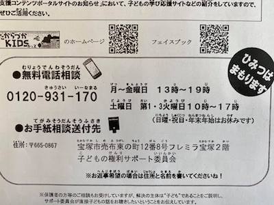 「宝塚市子どもの権利サポート委員会」から (子どもの悩み相談)に関する お手紙フォーム付おたより →学校を通して配布済み
